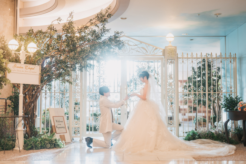 あたたかな日の差し込むガーデンにてプロポーズシーンの撮影♡ご新郎様の格好良い姿をしっかりとお写真に残します♡